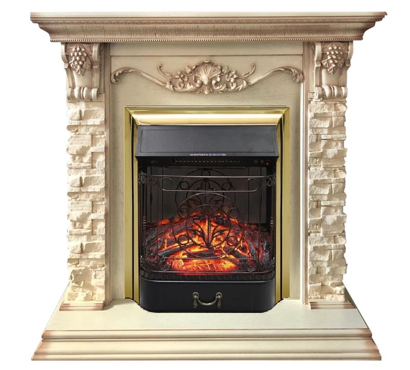 Электрокамин Adriana с очагом Majestic FX Brass Royal Flame, сланец бежевый и шпон слоновая кость
