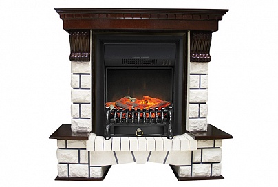 Электрокамин Pierre Luxe с очагом Fobos FX Brass Royal Flame, камень белый и шпон темный дуб